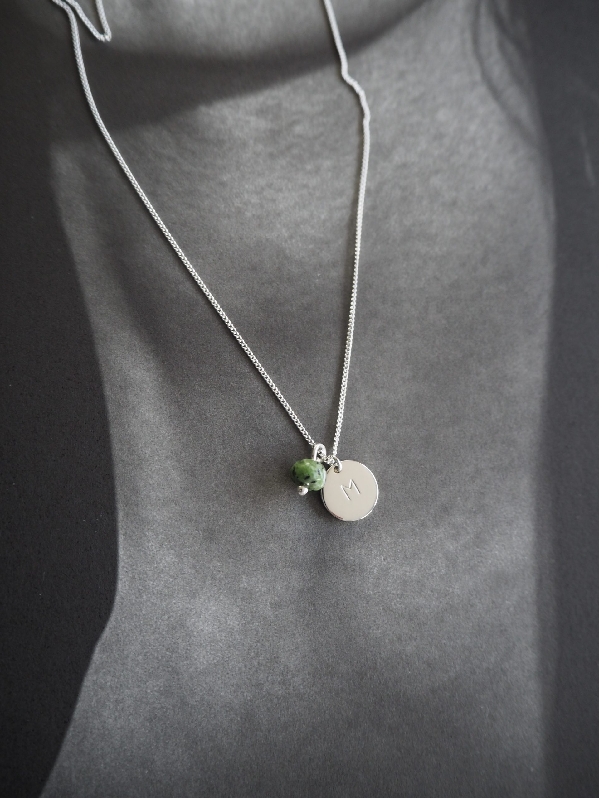 Colgante con una placa redonda (0,7cm/1cm aproximadamente de diámetro) + inicial personalizada + una Zoisita Sandía facetada redonda.